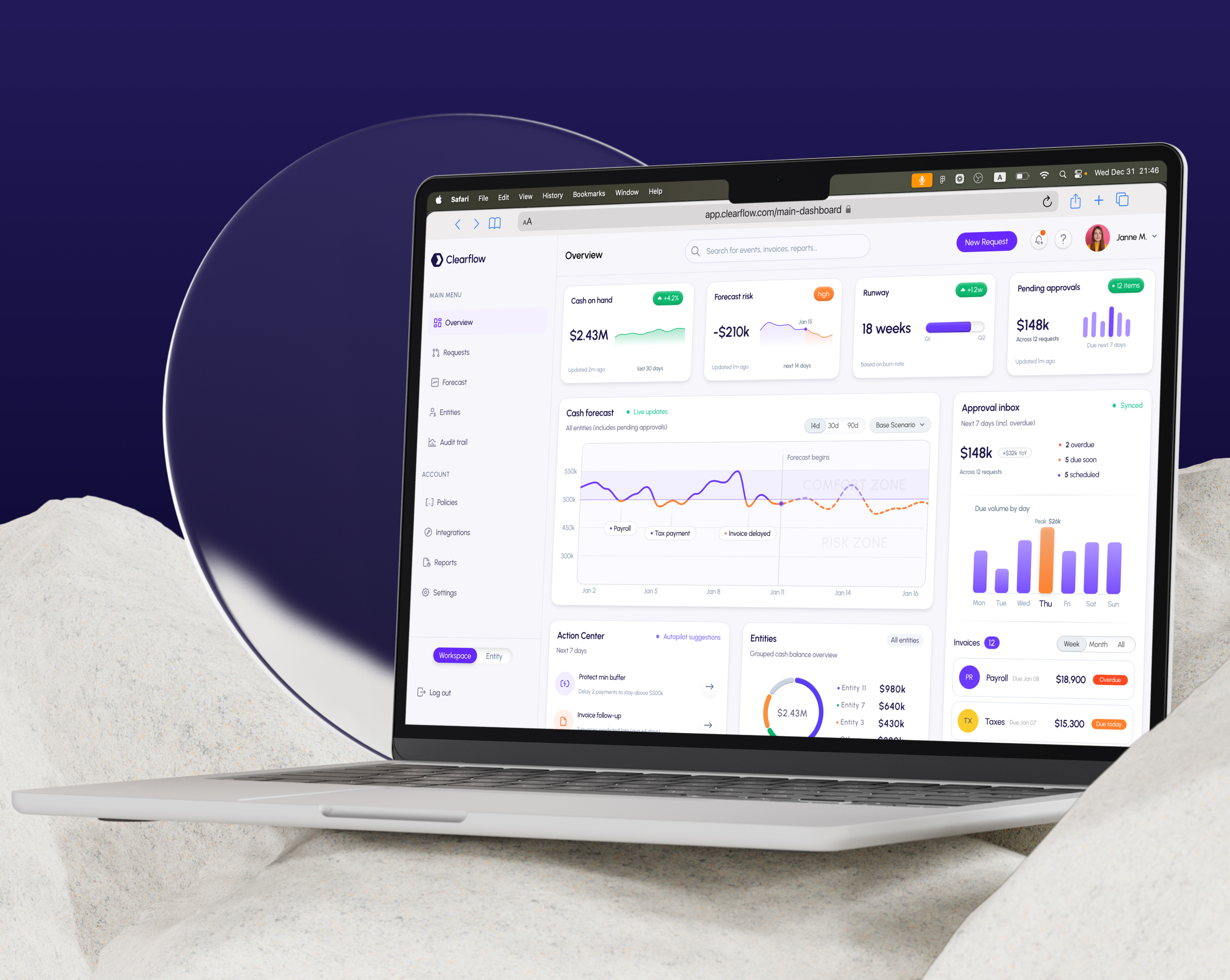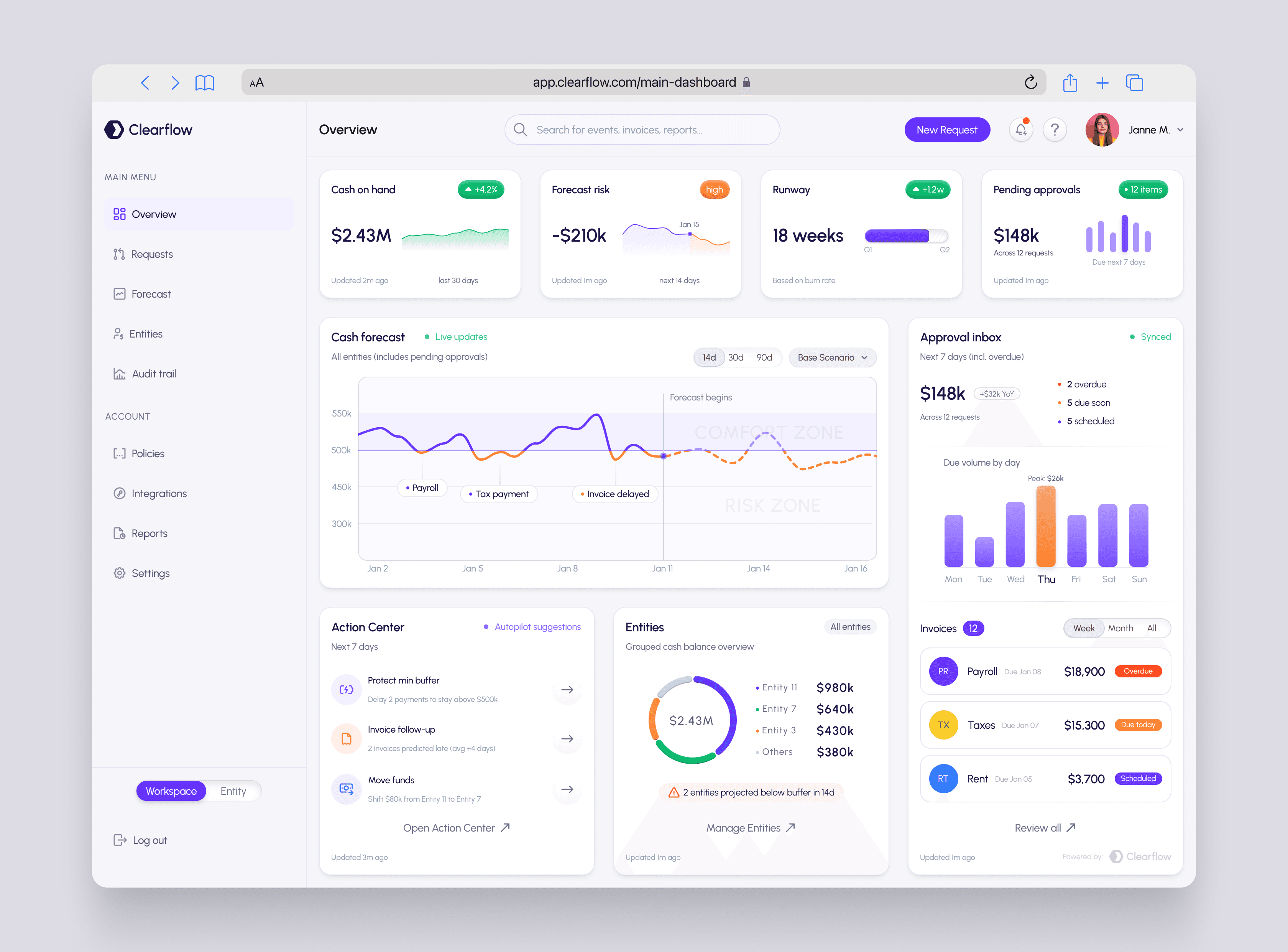 Main Dashboard (Overview): executive visibility + cash forecasting + actionable approvals.