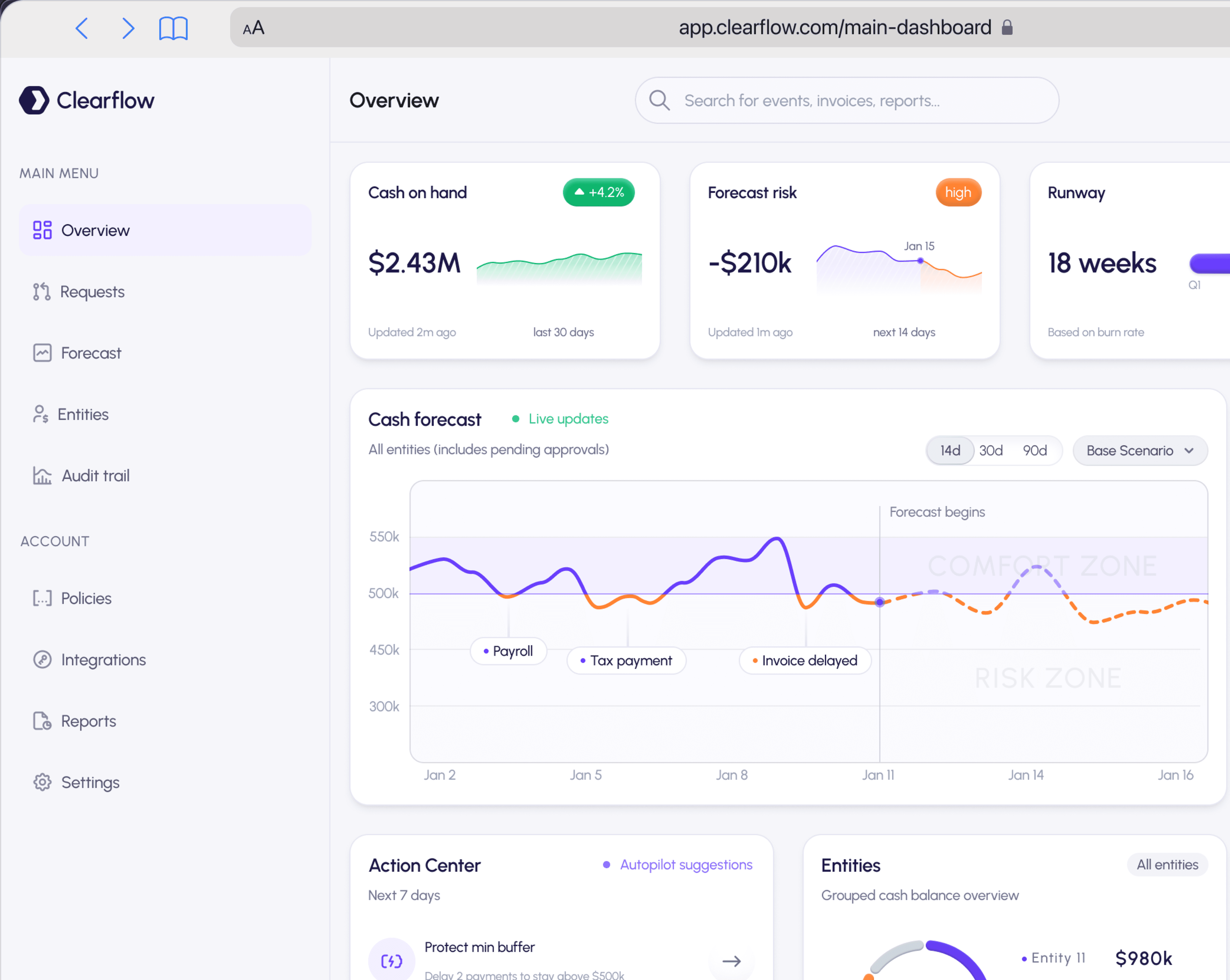 Risk callout (e.g., “2 entities projected below buffer in 14d”)