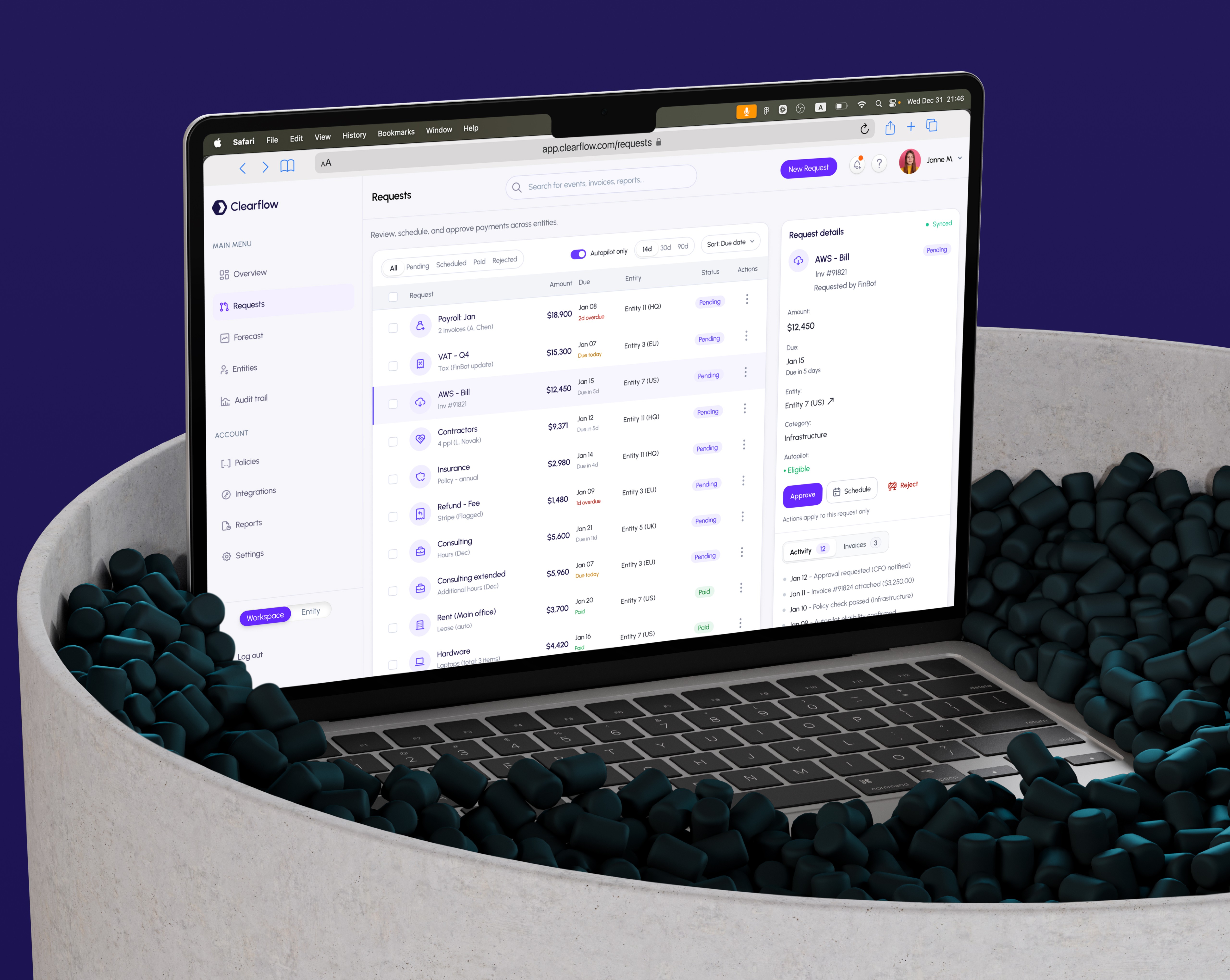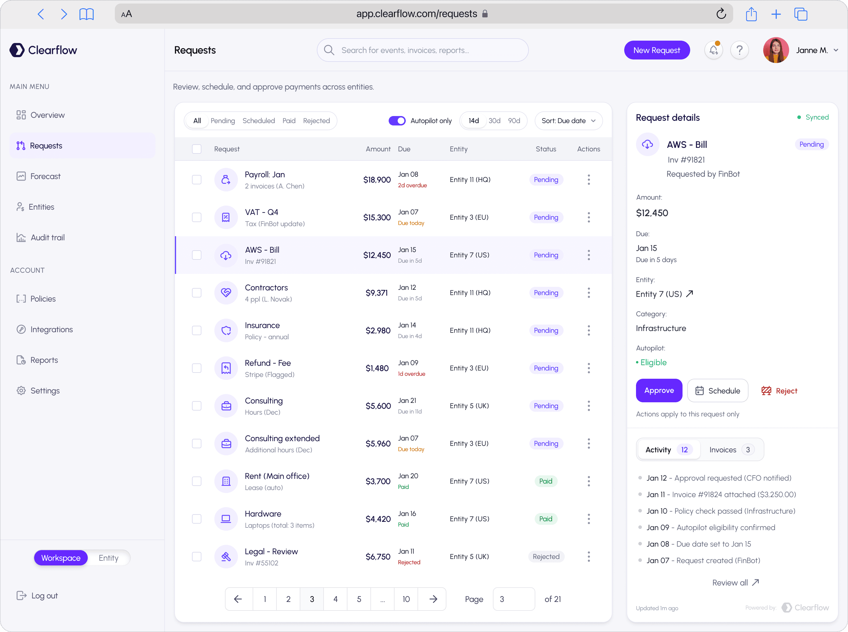 Requests: operational inbox to review, approve, schedule, and reject payments across entities.