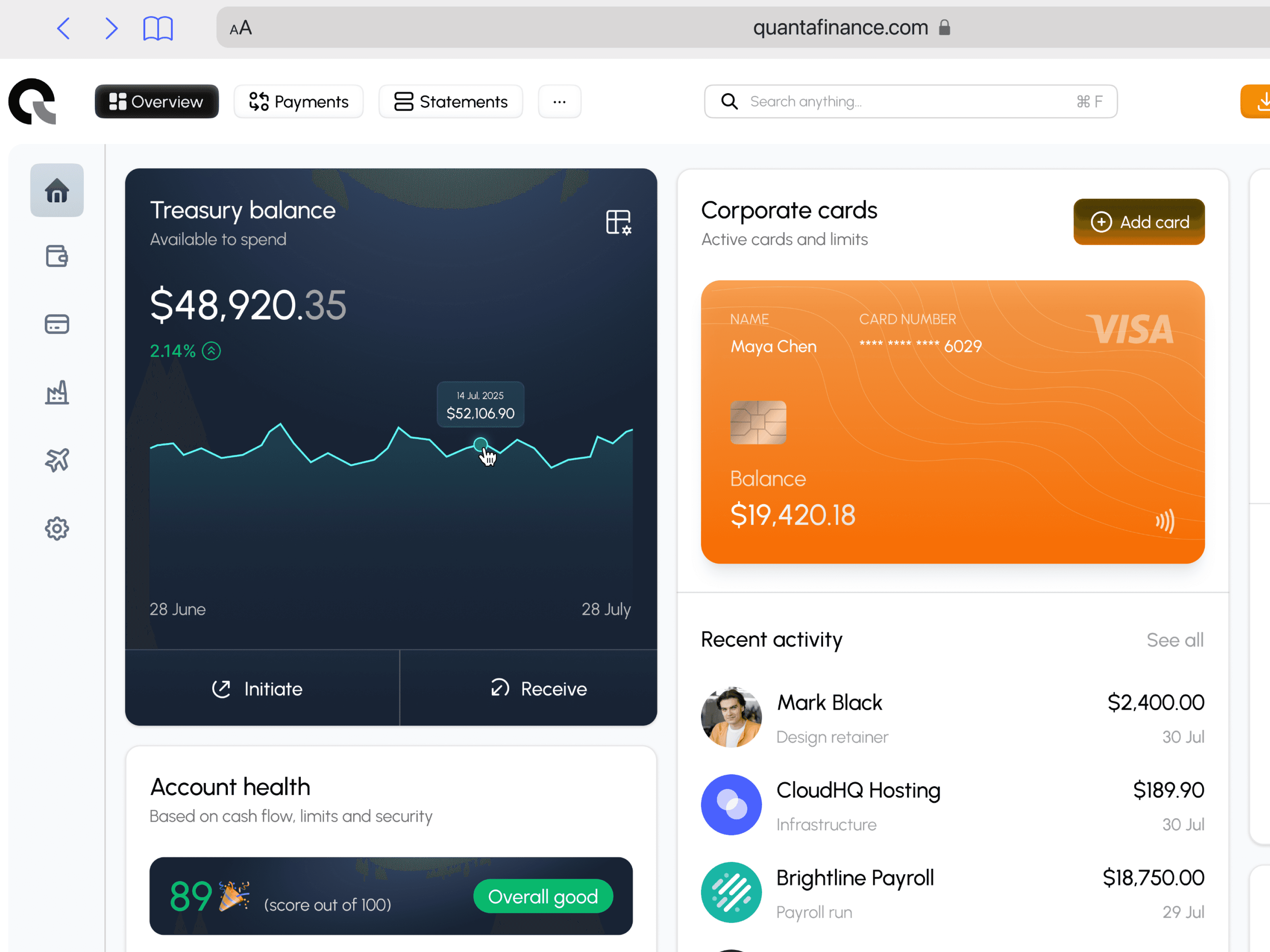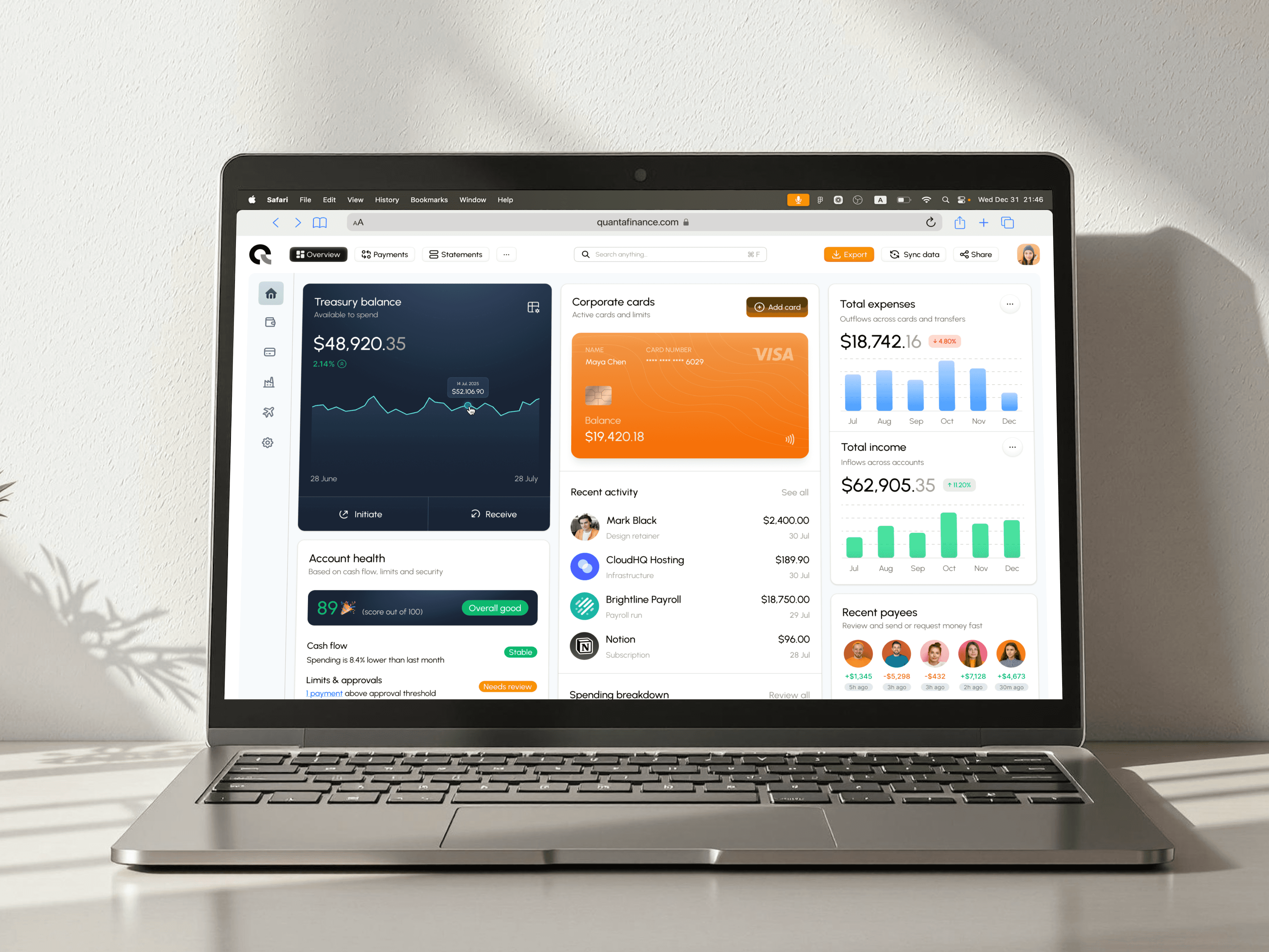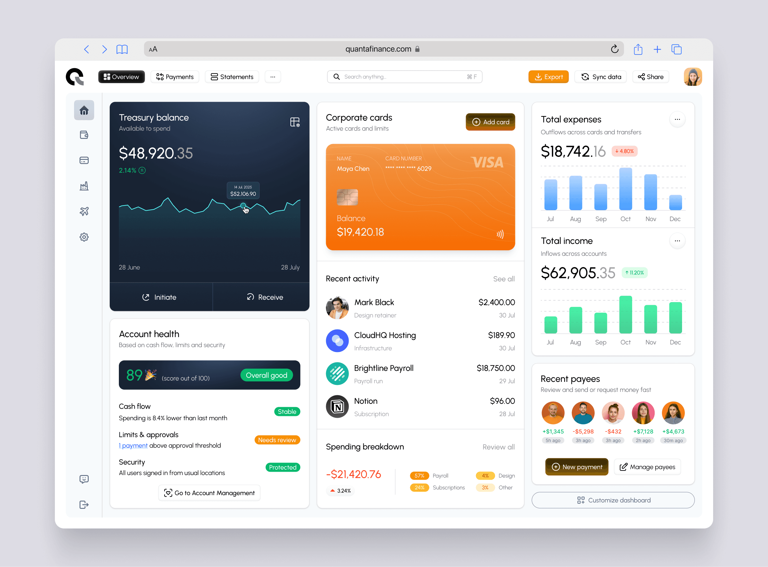 Quanta Finance is a B2B platform designed to help startups and SMBs manage cash position, corporate cards, and outgoing payments in one place. The product targets operators who need fast answers to daily finance questions: